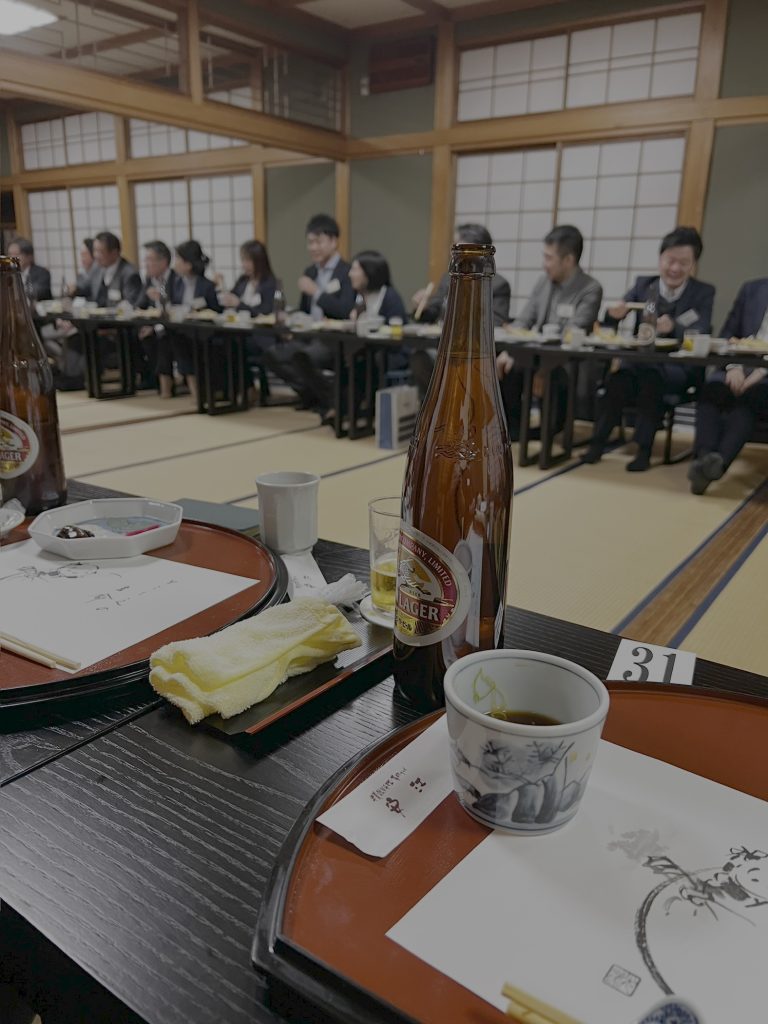 で、席に着いて横の人に挨拶・名刺交換をし、お話しながら食事が始まります。で、1時間ほど経ったらビンゴゲームとまでいきませんが、抽選会があってひと盛り上がりし、歌の余興があって、お客さんの近況報告と来年の目標なんかを聞いて2時間程度でお開き。土産に海苔を頂き、2次会へGO。