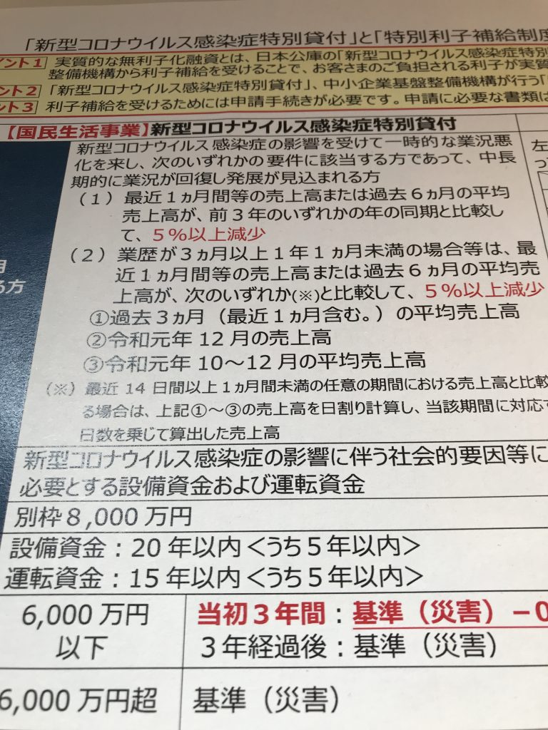 この特別貸付は、8000万まで借りれますし、条件クリアすれば3年間無利子です。銀行も5年間無担保無利子とかありますね。