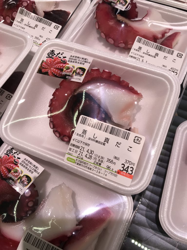 こういう形態のタコが売れる価格帯としては、関西ではプロパー100g198円、特売158円、関東ではプロパー238円~258円、特売198円です。