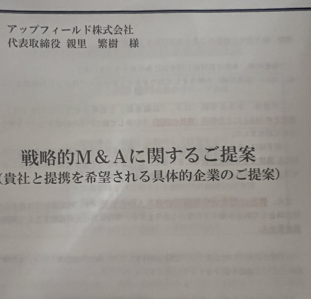 「貴社とのM&Aによる提携を打診して欲しいとの依頼を受け本書をお送りさせて頂きました」と書いてあります。売上高1000憶前後のグループ企業からだそうです。