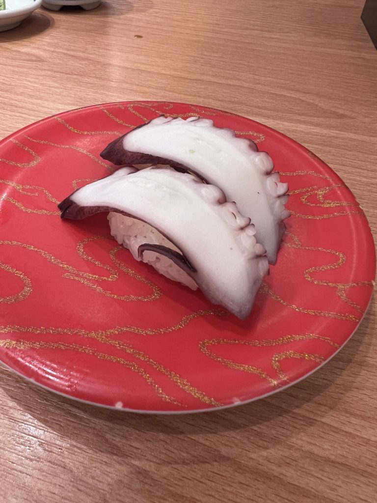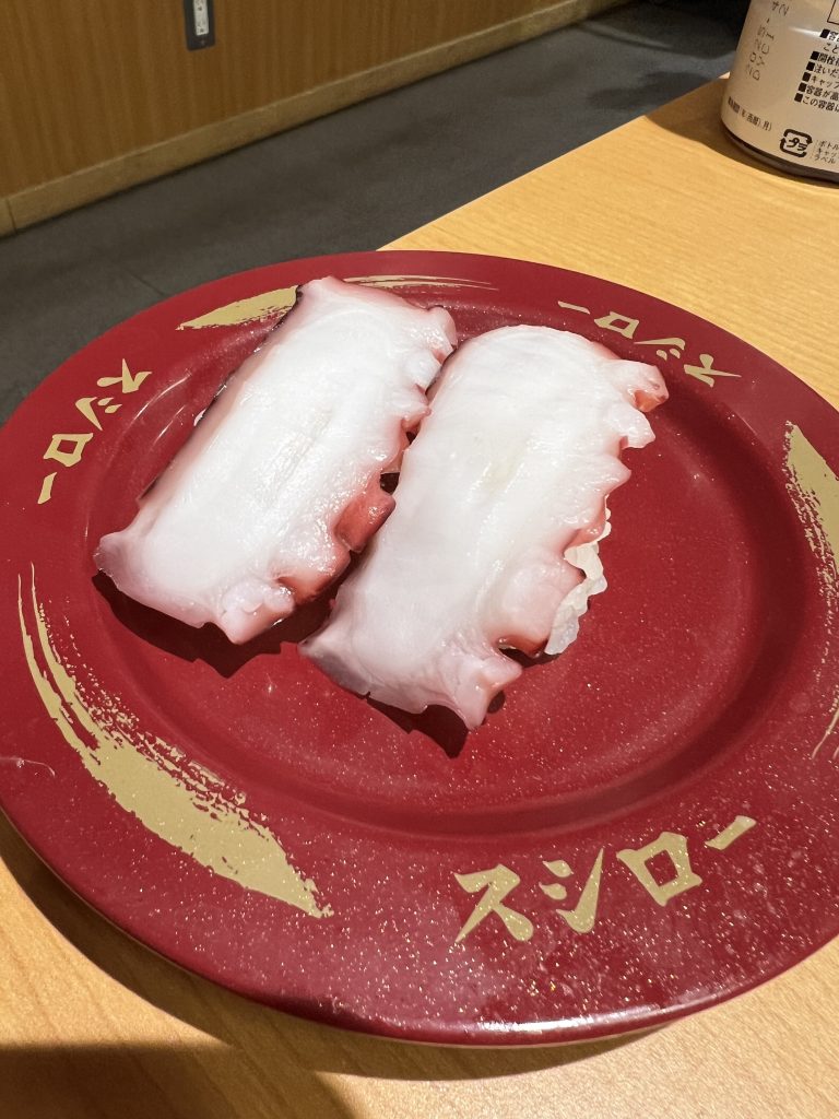 先日、台湾行った時にも回転寿司行きました。スシローではないですが。その時もタコ頼みました。240円でした。